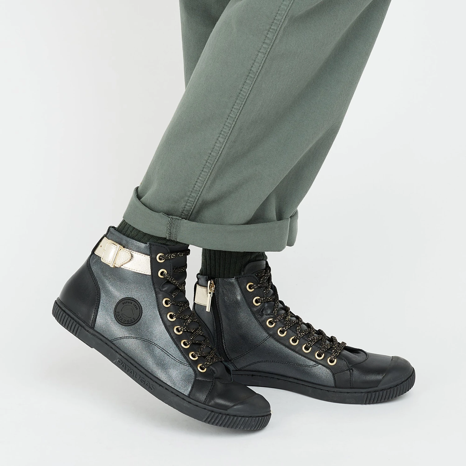 Adoptez cette saison la basket femme Latsa noir/dorĂ© inspirĂ©e depuis les modèles BANJOU et BONO. Cette basket montante femme nous sĂ©duit par sa tige en cuir lisse couleur noir et sa boucle dorĂ© pour la touche fĂ©minine. C’est une basket en cuir qui se mariera avec toutes vos tenues. Sa semelle est renforcĂ©e sur l’avant ce qui vous permettra de vous protĂ©ger des chocs. Cette basket montante est munie d’une fermeture Ă©clair sur le cĂ´tĂ© très pratique. Ce modèle taille grand, nous vous conseillons de prendre une pointure en dessous de votre pointure habituelle.